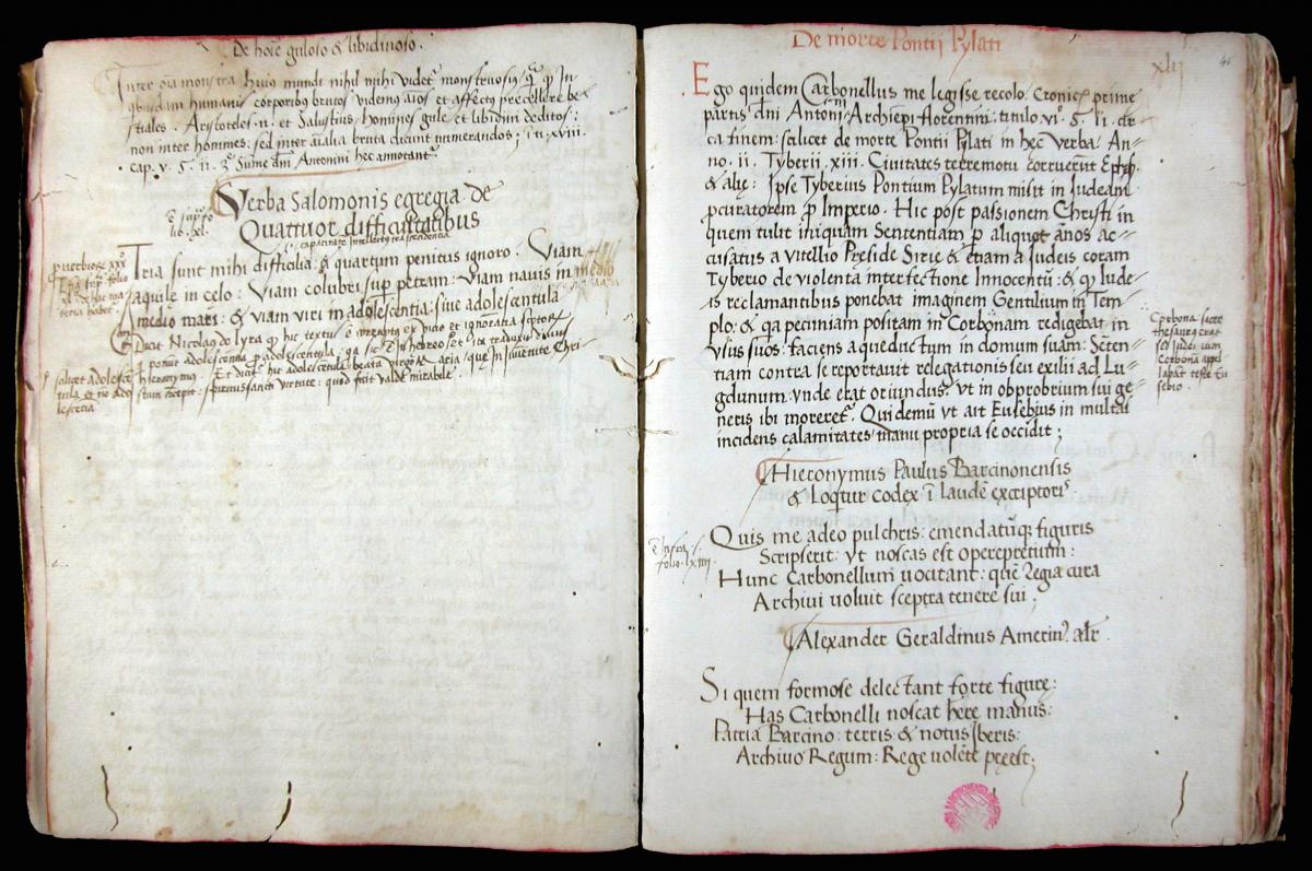 Al f. 46verso un epigrama autògraf de l'humanista Juan Sobrarias. Notes al marge d'una mà posterior. Alguns calderons, rúbriques, subratllats i notes marginals en vermell. Numeració moderna en tinta sobre una d'antiga difuminada en xifres romanes.