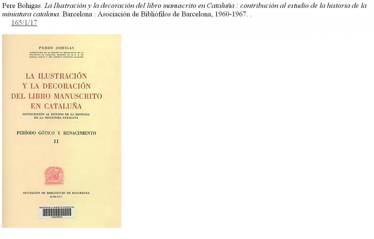 L'altre exemplar de bibliofília és l'obra en tres volums del bibliògraf Pere Bohigas La ilustración y la decoración del libro manuscrito en Cataluña, editada per l'Associació de Bibliòfils de Barcelona els anys 1959, 1965 i 1967.