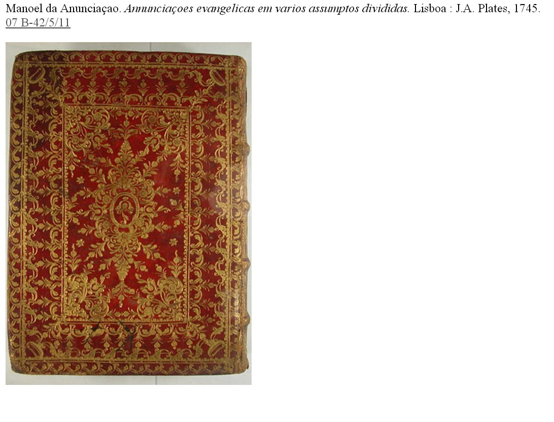 Una altra relligadura és de l'obra de Manoel da Anunciaçao Annunciaçoes evangelicas em varios assumptos divididas impresa a Lisboa el 1745. És una enquadernació de marroquí vermell amb doble enquadrament i centre profusament decorat amb motius vegetals.