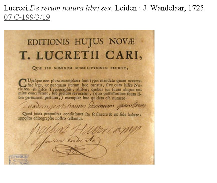 Els dos darrers volums de la secció tenen una relació directa amb la bibliofília. El primer és una edició del De rerum natura de Lucreci, editat per Syvert Haverkamp i imprès a Leiden per Jan Wandelaar. És la primera edició numerada de la història. Se'n tiraren només 820 exemplars i amb la intenció de no reeditar-lo, per tal de mantenir-ne el valor, tal com afirmen en una nota al final del primer volum l'editor i l'impressor. El nostre exemplar és el número 414 i porta les signatures autògrafes de l'editor literari Haverkamp i de l'impressor Wandelaar. Prové del convent de Santa Caterina de Barcelona.