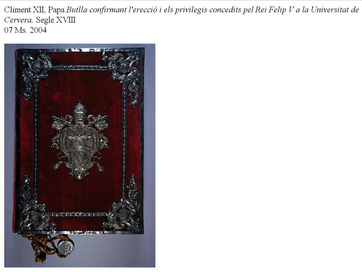 La darrera de les enquadernacions que presentem és la relligadura del manuscrit que conté la butlla del Papa Climent XII confirmant l'erecció i els privilegis concedits pel rei Felip V a la Universitat de Cervera. És una relligadura de l'any 1730, barroca, de vellut carmesí sobre posts amb cantoneres i ornamentació de plata; al centre de la tapa anterior hi ha l'escut del papa Climent XII i a la posterior, el del rei Felip V, ambdós repujats en plata.