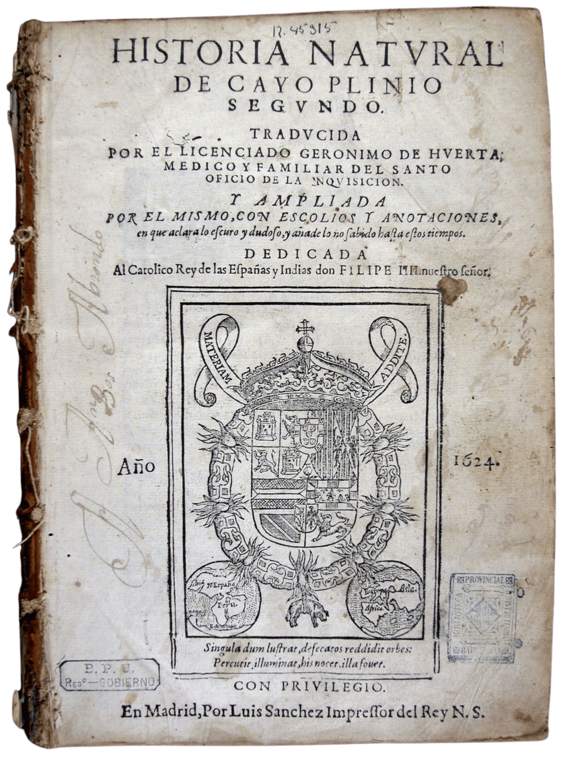 Plini Segon, Gai. Historia natural de Cayo Plinio Segundo / traducida por el licenciado Geronimo de Huerta … y ampliada por el mismo con escolios y anotaciones … Volum 1: En Madrid : por Luis Sanchez …, 1624.
