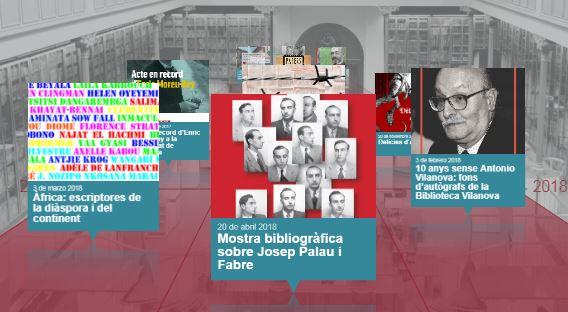 amb documents propis i d'altres biblioteques, cedits temporalment pel CRAI Biblioteca Pavelló de la República i el CRAI Biblioteca de Filosofia, Geografia i Història, principalment.