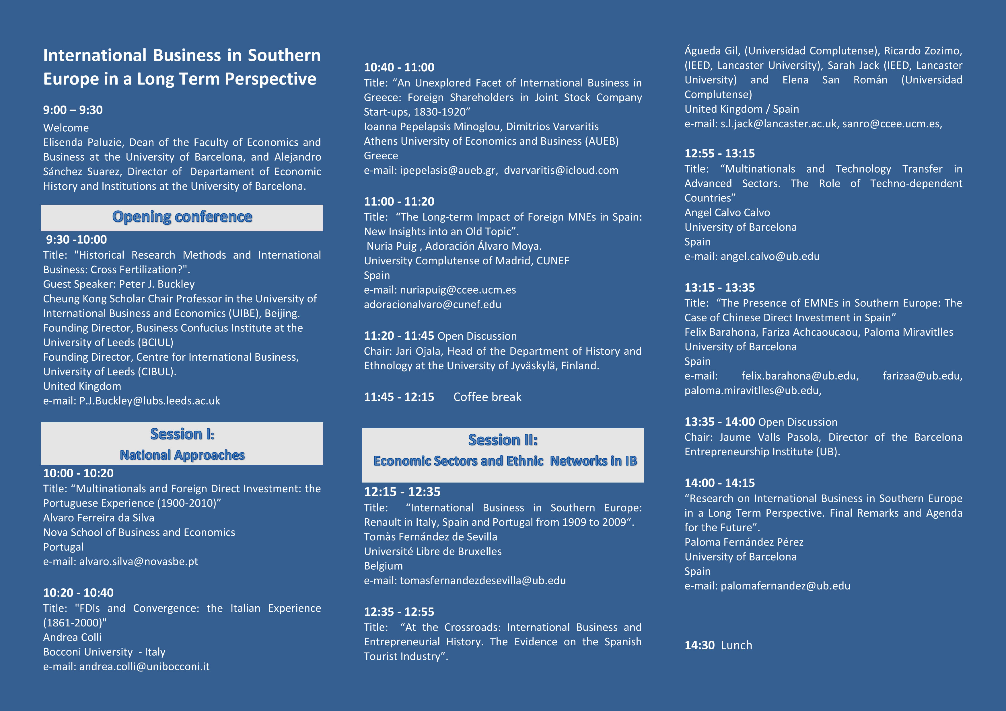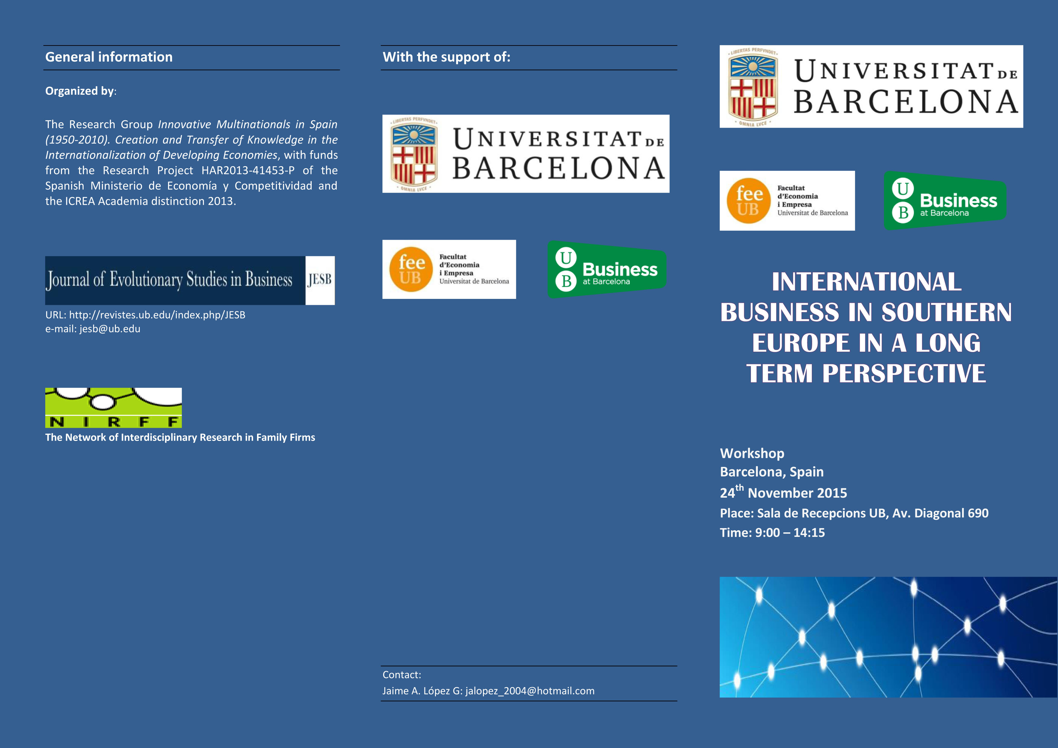 On the occasion of the "International Business in Southern Europe in a Long Term Perspective" workshop, organized by the Innovative multinationals in Spain ( 1950-2010 ). Creation and Transfer of Knowledge in the Internationalization of Developing Economies, to be held on 24 November, the CRAI Library of Economics and Business display different bibliographic materials of the speakers as a supplement this workshop.