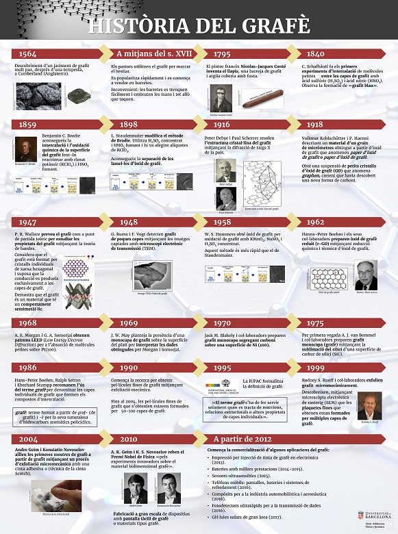 El començament de la història del grafè es podria datar el 1859 quan B. Brodie obté òxid de grafè per reacció del grafit amb àcids forts i observa la seva estructura laminar. Durant els cent anys següents, només es publiquen uns pocs articles sobre l’estructura laminar de l’òxid de grafè. El 1948, G. Ruess i F. Vogt observen flocs d’òxid de grafè de pocs nanòmetres de gruix mitjançant microscòpia electrònica i, el 1962, H.-P. Boehm i col·laboradors preparen òxid de grafè reduït i identifiquen monocapes de grafè entre els residus. Fins al 2009-2010, aquesta observació tan rellevant rep poca atenció dels científics. A principis de la dècada de 1970, s’aconsegueix dipositar carboni en monocapes de grafè sobre altres materials. El 2004, A. Geim i K. Novoselov aïllen el grafè per primera vegada mitjançant exfoliació mecànica de grafit pirolític altament ordenat amb una cinta adhesiva i el 2010 els concedeixen el Premi Nobel de Física per les seves investigacions fonamentals sobre el grafè i la determinació de les propietats excepcionals i les aplicacions potencials d’aquest material.