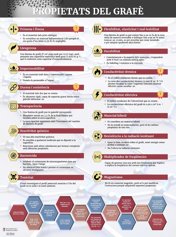 El terme grafè defineix una làmina d’àtoms de carboni units formant una xarxa hexagonal d’un àtom de gruix. És una forma al·lotròpica plana, és a dir bidimensional, del carboni amb unes propietats excepcionals que li confereix la seva estructura atòmica interna. Entre les seves propietats destaquen ser el material més prim i fort conegut, el millor conductor de la calor i de l’electricitat, i ser gairebé transparent.