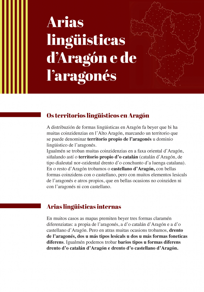 Áreas lingüísticas de Aragón y del aragonés es una exposición en la que, aprovechando las herramientas que ofrece la geografía lingüística, a través de 58 mapas se muestran diferentes tipologías de distribución territorial de palabras o formas propias de la lengua aragonesa dentro de su dominio lingüístico (Alto Aragón) y en Aragón. Los mapas permiten igualmente ver las formas propias del catalán en el este de Aragón y las del castellano de Aragón en el resto del territorio, así como las que se registran en Navarra (vascas en el norte; a menudo semejantes a las del aragonés en el este) y en la Rioja (generalmente castellanas).