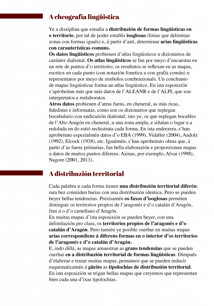 En muchos mapas de esta exposición se pueden ver, con una delimitación bastante clara, los territorios propios del aragonés y del catalán de Aragón. Pero también es posible observar en muchos mapas áreas correspondiente a diferentes formas en el interior de los territorios del aragonés y del catalán de Aragón.