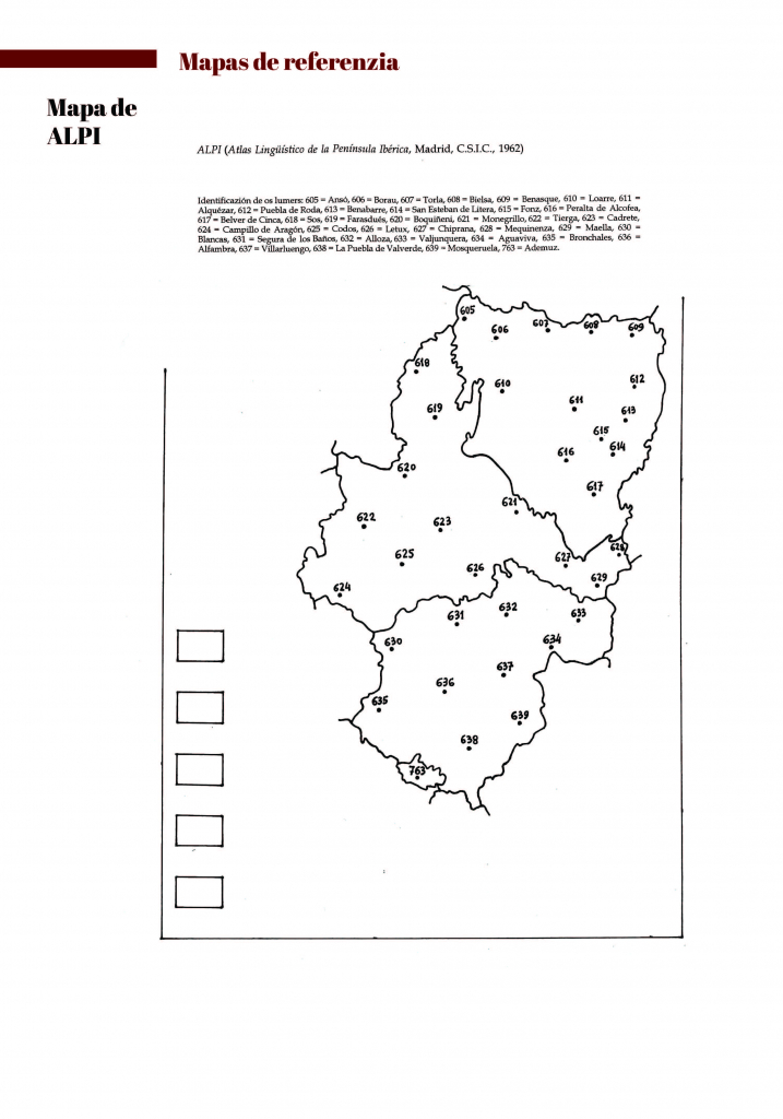 - NAGORE LAÍN, Francho (2004): “O territorio propio de l’aragonés seguntes quinze mapas de l’ALEANR”, en Estudios e rechiras arredol d’a luenga aragonesa e a suya literatura. Aurtas d’a III Trobada [Uesca-Alquezra, 17-20 otubre 2001], Uesca, Instituto de Estudios Altoaragoneses / Consello d’a Fabla Aragonesa, 2004, pp. 339-369.