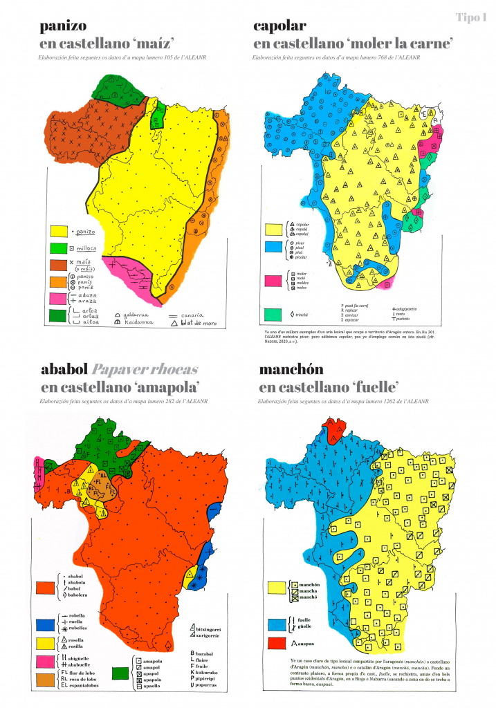 En muchos casos los mapas permiten ver tres formas claramente diferenciadas: la propia del aragonés, la del catalán de Aragón y la del castellano de Aragón. Pero en otras muchas ocasiones encontramos, dentro del aragonés, dos o más tipos léxicos o dos o más formas fonéticas diferentes. Igualmente podemos encontrar varios tipos o formas diferentes dentro del catalán de Aragón y dentro del castellano de Aragón.