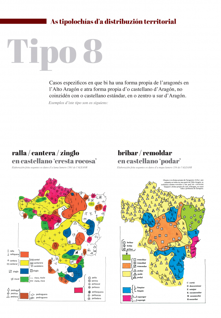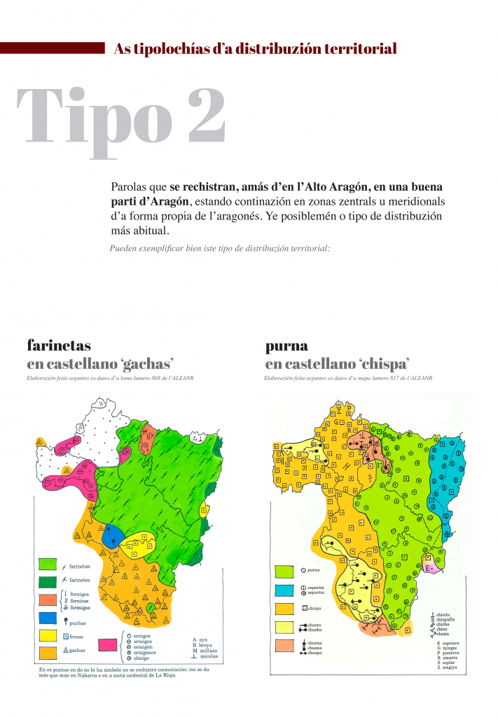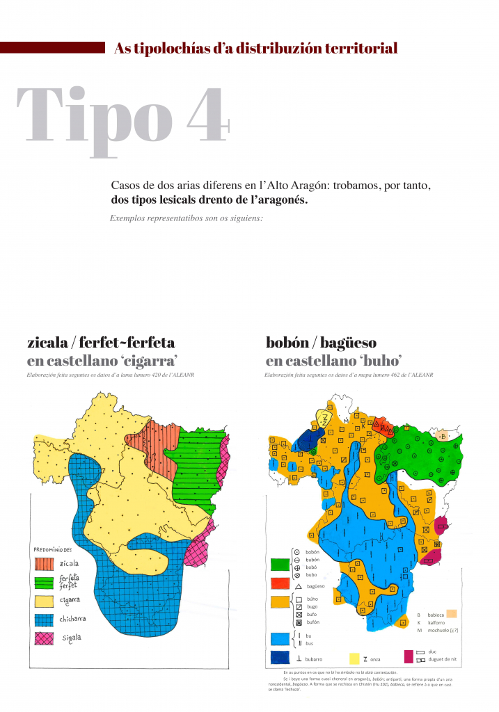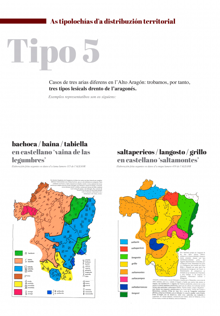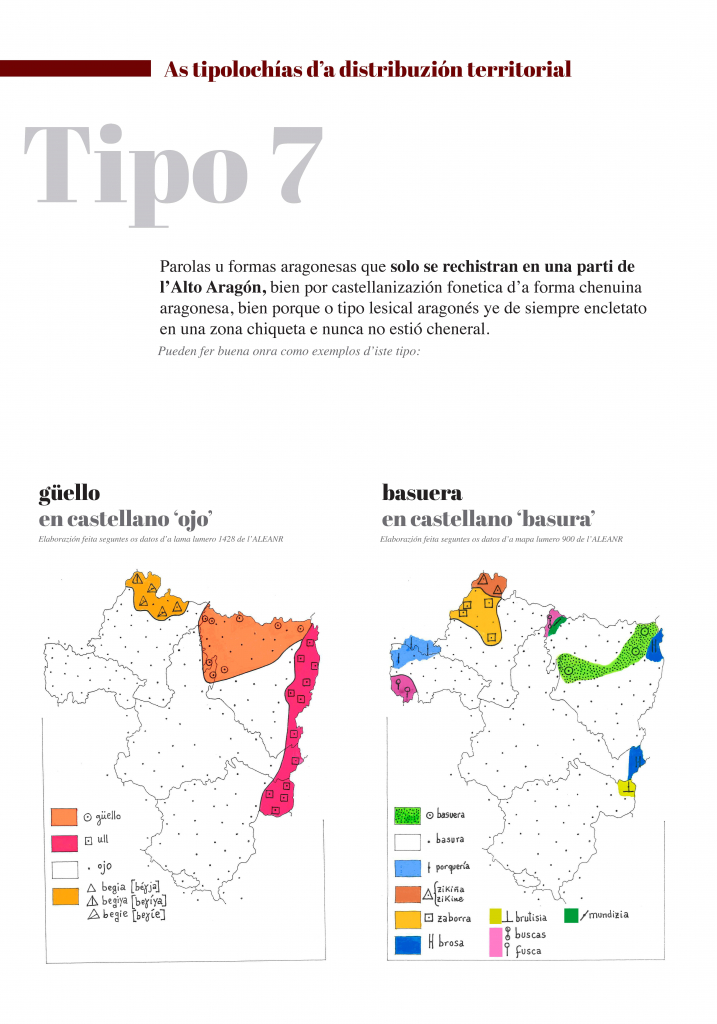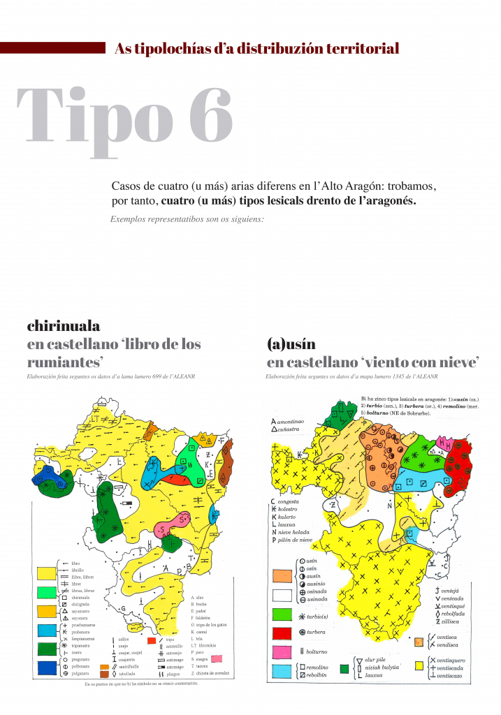 E, indo dillá, as mapas amuestran as grans tendenzias que se pueden oserbar en a distribuzión territorial de formas lingüisticas. Dimpués d’elaborar e trazar muitas mapas, pensamos que se pueden reducir esquematicamén á güeito as tipolochías de distribuzión territorial. En ista esposizión se trigan bellas mapas que creyemos que representan bien cada una d’ixas tipolochías.