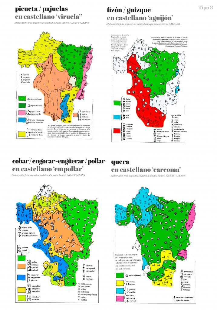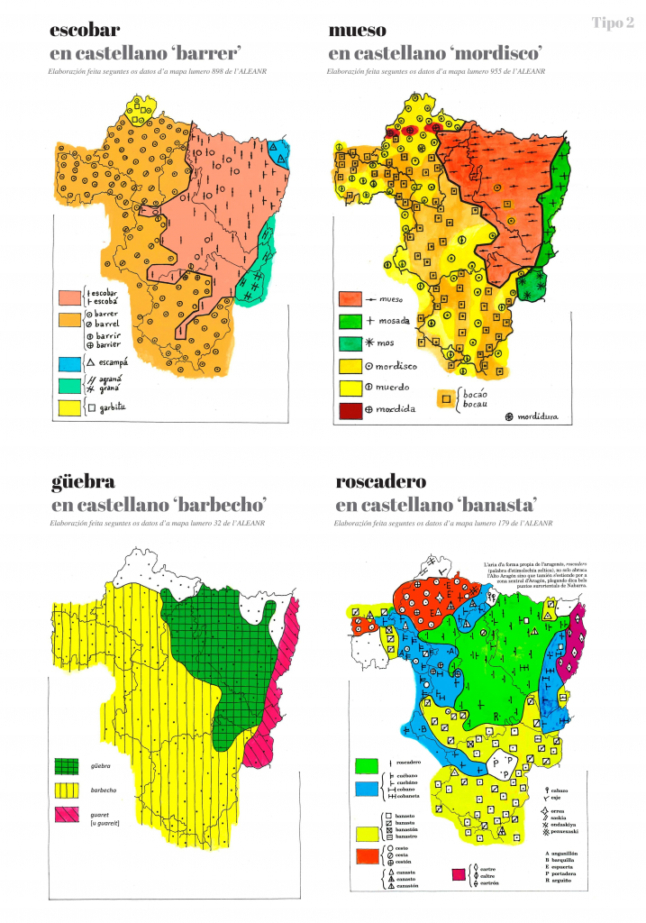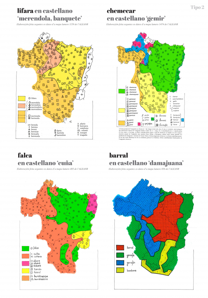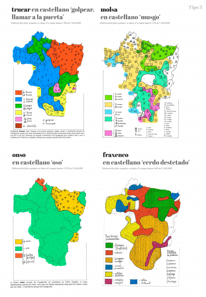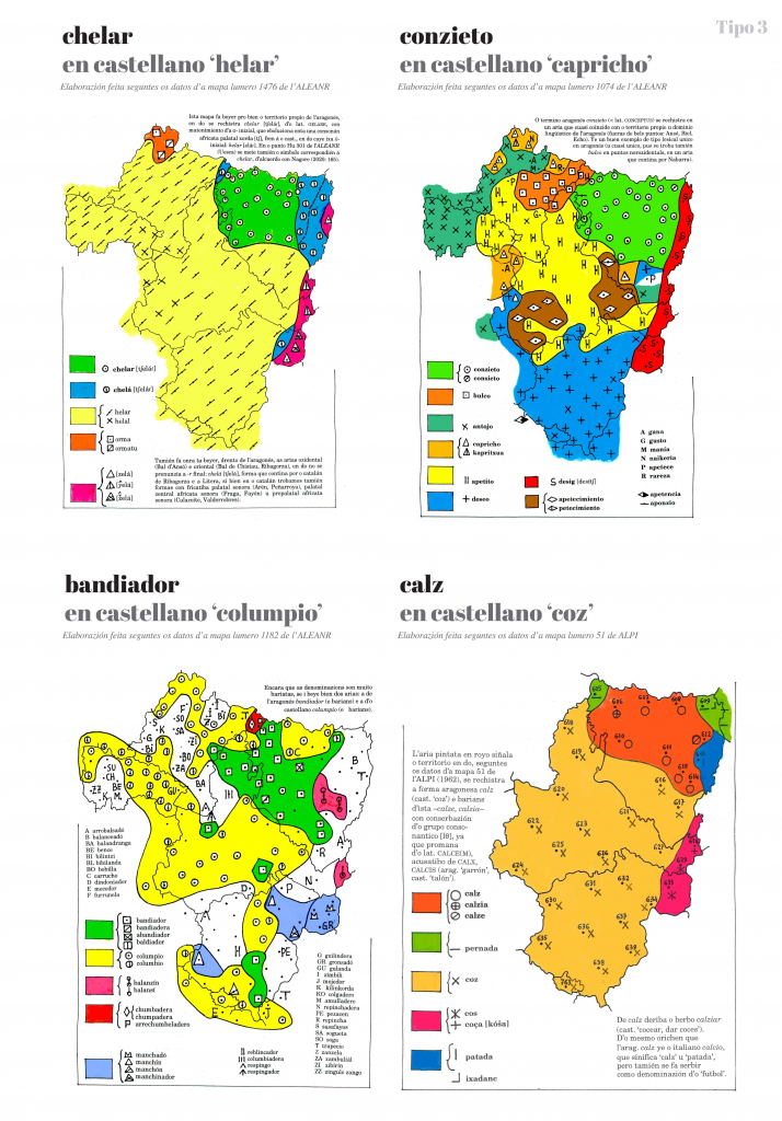 En muitos casos as mapas premiten beyer tres formas claramén diferenziatas: a propia de l’aragonés, a d’o catalán d’Aragón e a d’o castellano d’Aragón. Pero en atras muitas ocasions trobamos, drento de l’aragonés, dos u mas tipos lesicals u dos u más formas foneticas diferens. Igualmén podemos trobar barios tipos u formas diferens drento d’o catalán d’Aragón e drento d’o castellano d’Aragón.