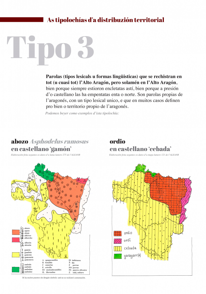 Tipo 3. Parolas (tipos lesicals u formas lingüisticas) que se rechistran en tot (u cuasi tot) l’Alto Aragón, pero solamén en l’Alto Aragón, bien porque siempre estioron encletatas astí, bien porque a presión d’o castellano las ha empentatas enta o norte. Son parolas propias de l’aragonés, con un tipo lesical unico, e que en muitos casos definen pro bien o territorio propio de l’aragonés. Podemos beyer como exemplos d’ista tipolochía: