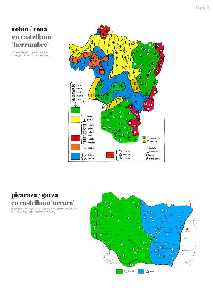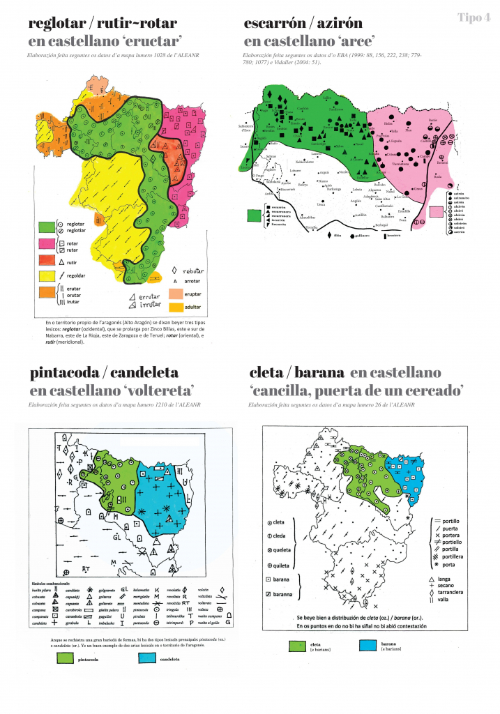 Tipo 4. Casos de dos áreas diferentes en el Alto Aragón: encontramos, por tanto, dos tipos léxicos dentro del aragonés. Ejemplos representativos son los siguientes: