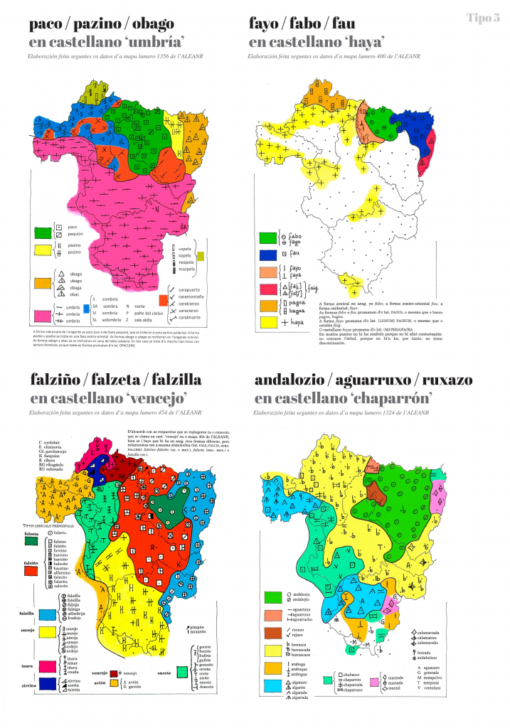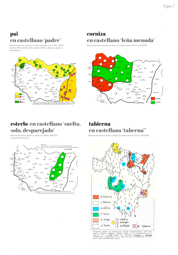 Y, yendo más allá, los mapas muestran las grandes tendencias que se pueden observar en la distribución territorial de formas lingüísticas. Después de elaborar y trazar muchos mapas, pensamos que se pueden reducir esquemáticamente a ocho las tipologías de distribución territorial. En esta exposición se seleccionan algunos mapas que creemos que representan bien cada una de esas tipologías.