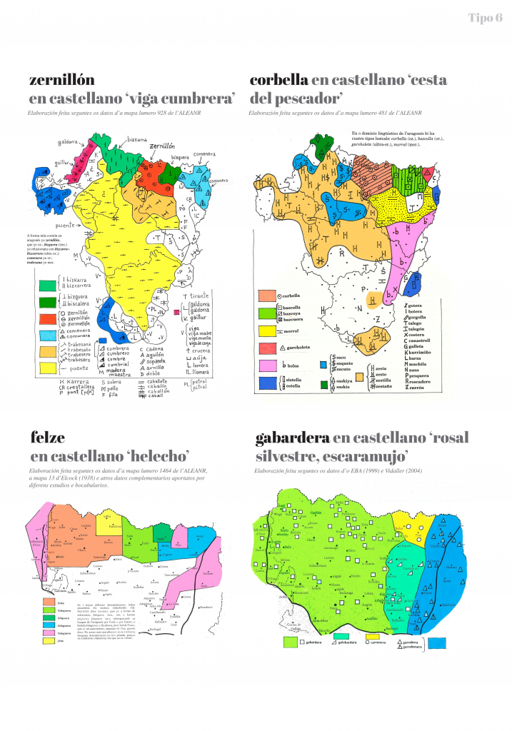 Tipo 6. Casos de cuatro (o más) áreas diferentes en el Alto Aragón: encontramos, por tanto, cuatro (o más) tipos léxicos dentro del aragonés. Ejemplos representativos son los siguientes: