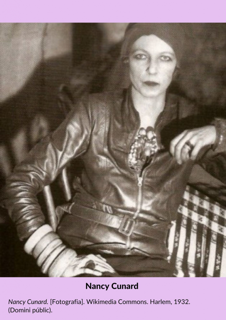 Nancy Cunard va ser una escriptora, poeta, editora i activista política britànica que va estar profundament involucrada en diverses causes socials i polítiques, inclosa la Guerra Civil espanyola. Cunard, nascuda el 1896, provenia d'una rica família britànica i va utilitzar el seu privilegi per defensar la justícia social durant tota la seva vida.