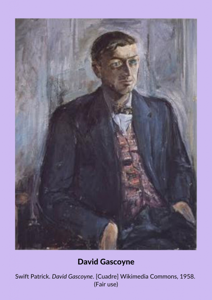 David Gascoyne va ser un poeta, escriptor i traductor anglès. El 1933, va visitar París i es va fer coneixedor d'artistes surrealistes com Max Ernst, Paul Éluard i Salvador Dalí. Gascoyne va jugar un paper significatiu en la promoció del moviment surrealista a Gran Bretanya; va escriure A Short Survey of Surrealism (1935) i va organitzar l'Exposició Internacional Surrealista de Londres el 1936 amb Herbert Read i Roland Penrose. També va traduir algunes obres clau del surrealisme a l'anglès, com ara What is Surrealism? d'André Breton. El 1936, va viatjar a Barcelona per ajudar a la Oficina de Propaganda del Govern Català durant la Guerra Civil Espanyola.