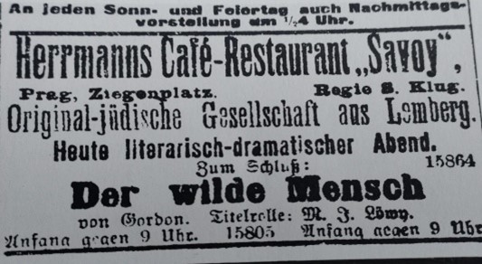 ara dedica pàgines a descriure els gests de la senyora Tschissik, amb digressions pel mig sobre la compassió que l’inspiren els actors, o bé fa una anàlisi de l’obra Der wilde Mensch [El salvatge] que, amb pocs mitjans, interpreten, entre d’altres, la mateixa Tschissik i l’actor Jizchak Löwy, bon amic seu. De les moltes representacions de l’obra, mostrem per exemple l’anunci de la representació d’El salvatge al Prager Tagblatt del 22 de desembre de 1911 (Wagenbach 1983: 118).
