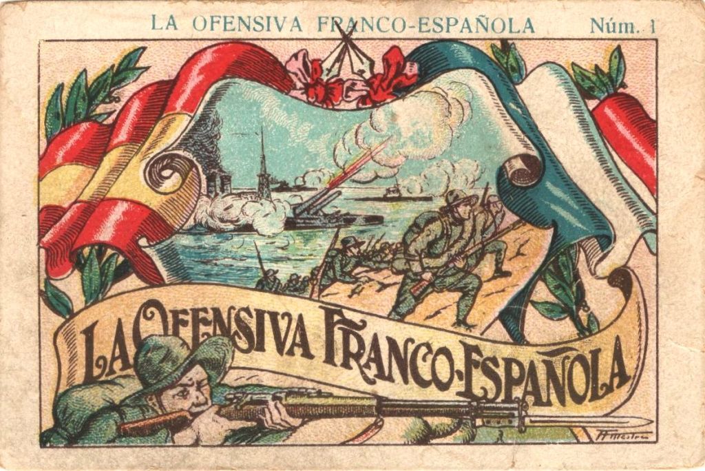 Una temàtica molt present al cromo antic és la militar. Al CRAI Biblioteca del Pavelló de la República només trobem cromos de tres col·leccions: una sobre el raid aeri Espanya-Argentina a bord de l’hidroavió militar Plus Ultra, que va tenir lloc l’any 1926, i dues sobre la Guerra del Rif.