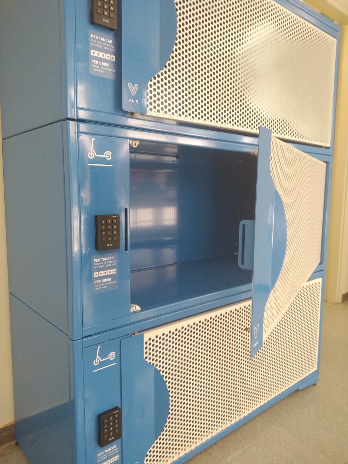 A partir d’aquest curs 21/22, el CRAI Biblioteca de Belles Arts disposa de tres armariets per a l’aparcament de patinets plegables, que es troben situats a la planta 0 de l’edifici Biblioteca, davant les escales que baixen a la planta soterrani.