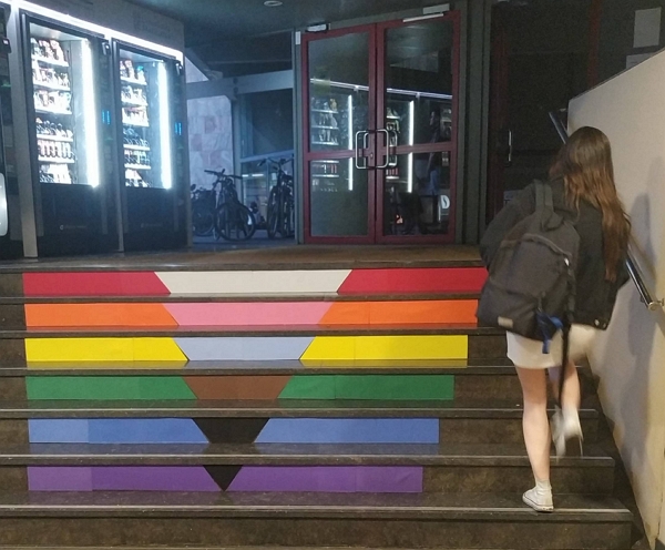 De l'altra, la decoració, un any més, de les escales d'entrada al CRAI Biblioteca amb els colors de la bandera LGTBIQ+. Aquesta actuació porta el nom d'Escales orgulloses i en aquesta ocasió hi suma més colors.
