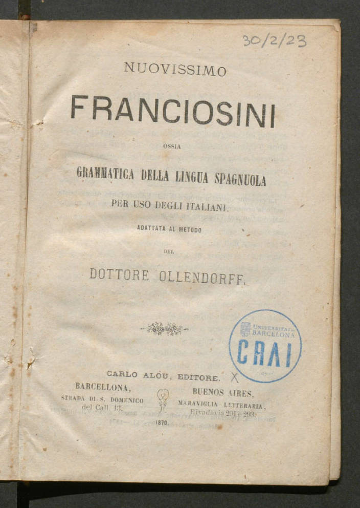 • Franciosini,Lorenzo. Nuovissimo Franciosini : cossia grammatica della lingua spagnuola per uso degli italiani : Adattata al metodo del Dottore Ollendorff. Barcelona : C. Alou, 1870 (Disponible a BiPaDi)