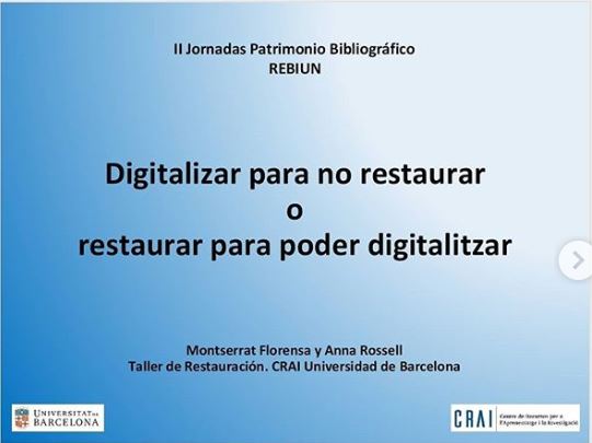 Per la seva part, Montserrat Florensa ha presentat la comunicació Digitalizar para no restaurar o restaurar para poder digitalizar que parla de les dificultats de digitalitzar certs documents en molt mal estat de conservació, tot fent una reflexió sobre com de vegades és del tot necessari restaurar per poder digitalitzar, i d’altres, com la digitalització pot fer oblidar la necessitat de restaurar un document amb el risc de perdre’l definitivament. La digitalització és molt pràctica per a la consulta dels usuaris, però cal no oblidar que el que estem conservant és una fotografia de l’original però no l’original amb el valor que aquest té.