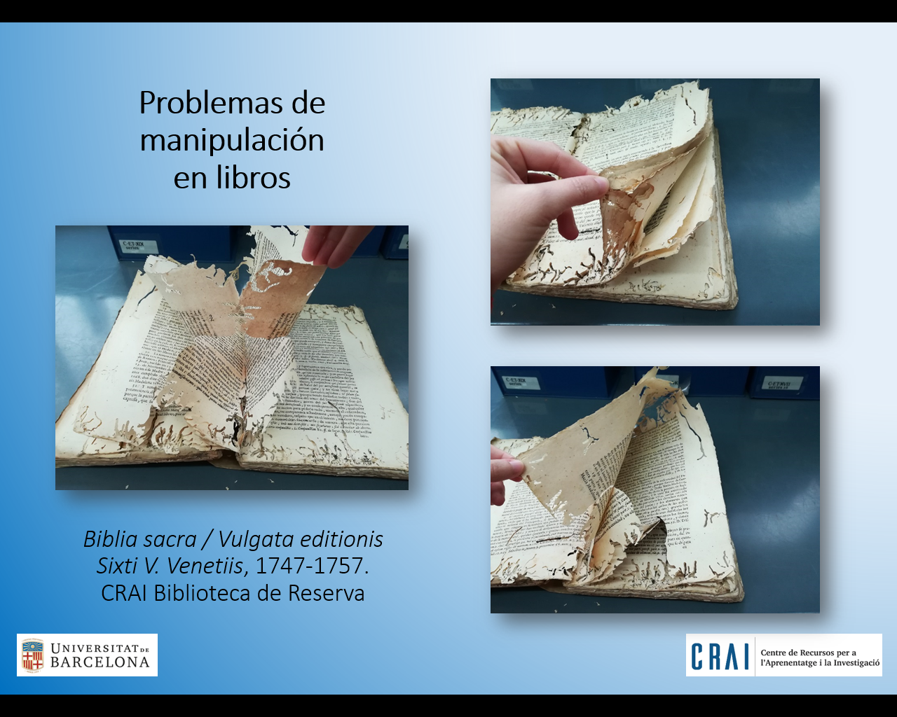 Les Jornadas s’han estructurat en dos bloc temàtics diferenciats: Gestió de la col·lecció, i Restauració i Conservació. El CRAI de la UB ha participat en tots dos blocs amb comunicacions defensades per Gemma Caballer del CRAI Biblioteca de Reserva, en el primer bloc, i per Montserrat Florensa i Anna Rossell del CRAI Taller de Restauració, en el segon.