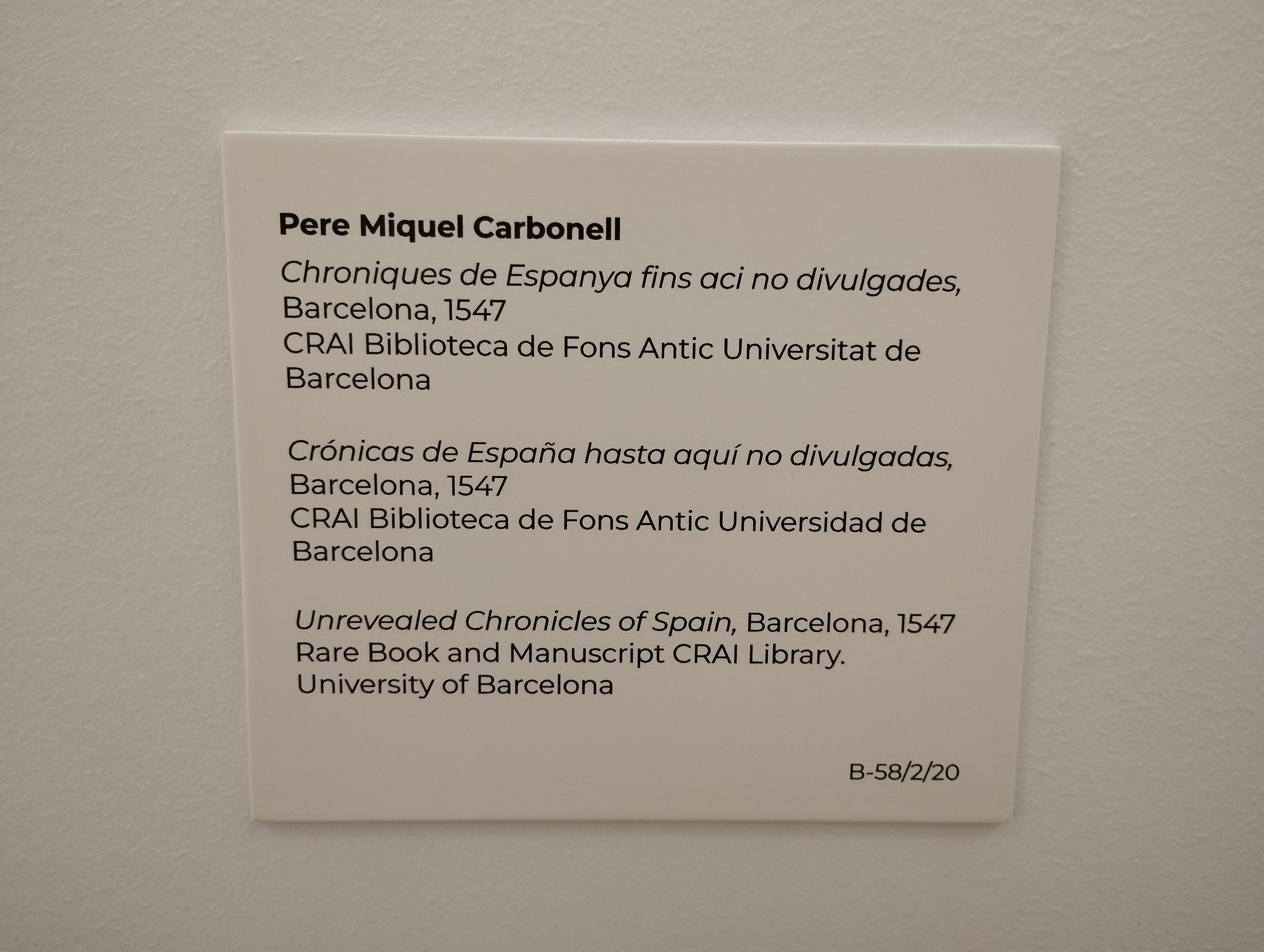 Es tracta de les conegudes Cròniques d’Espanya de Pere Miquel Carbonell, impreses a Barcelona per Carles Amorós el 1547. El CRAI Biblioteca de Fons Antic en custodia dos exemplars, un dels quals ha estat restaurat pel Taller de Restauració Rossell Badia amb el finançament de l’Ajuntament de Molins de Rei per a aquesta ocasió.