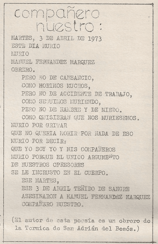 Es tracta d'un poema publicat a Libertad para los 4 obreros de la térmica: libertad para los 10 de Carabanchel de l’any 1973 editat pel Partido Comunista de España. Parla de l’assassinat de Manuel Fernández Márquez, treballador de Construcciones Pirinaicas (COPISA) a la Central Tèrmica del Besòs, a mans de les forces policials franquistes.