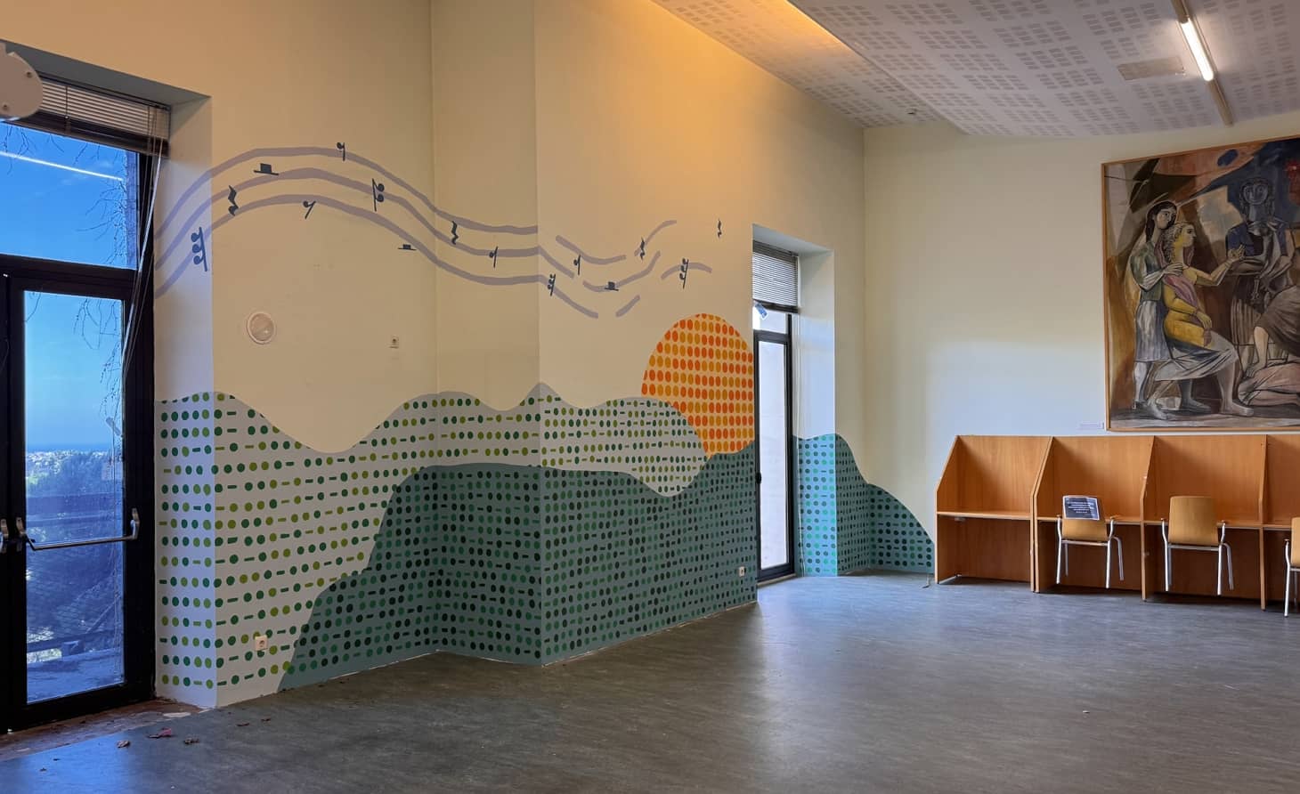 Els estudiants de la menció en Educació Visual i Plàstica del 4t curs del Grau en Mestre en Educació Primària han treballat en la creació d'un mural dins de l'assignatura Cultura Visual i Infància, impartida pels professors Arola Valls i Enric Font Company. Aquesta iniciativa ha donat lloc a una obra que no només embelleix l'espai sinó que també reforça la seva funció: fomentar un ambient de silenci i concentració.