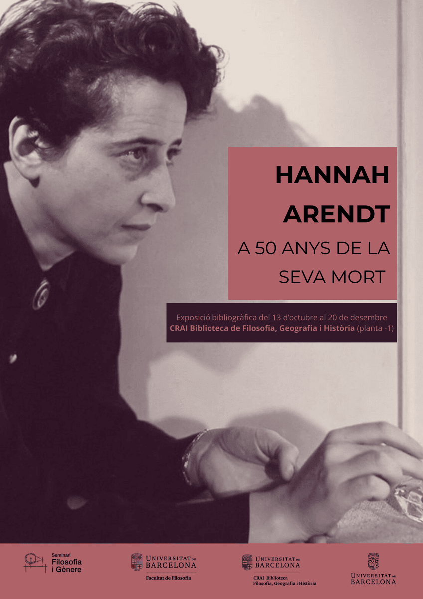 Del 13 d’octubre al 20 de desembre, el CRAI Biblioteca de Filosofia, Geografia i Història acull una exposició bibliogràfica dedicada a la filòsofa i pensadora política Hannah Arendt (1906–1975), en commemoració dels 50 anys de la seva mort.