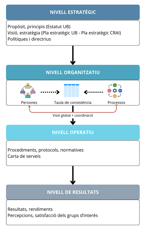 El model del CRAI es deriva del Model de gestió per processos de la Universitat de Barcelona que, al seu torn, està inspirat en el Model d’Excel·lència de la Fundació Europea per a la Gestió de la Qualitat (EFQM) i està estructurat en quatre nivells: estratègic, organitzatiu, operatiu i resultats.