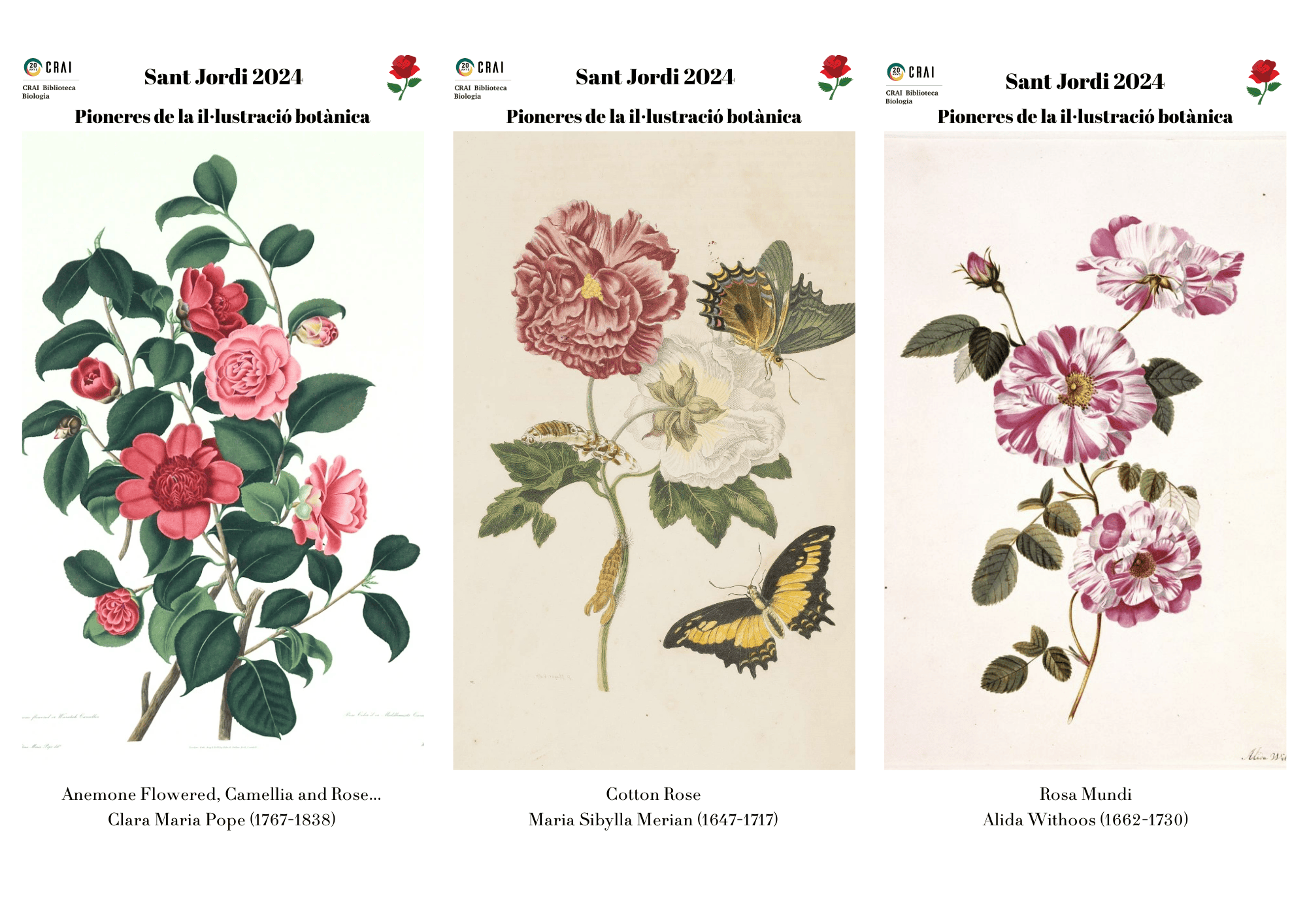 Paral·lelament a la mostra bibliogràfica, durant la setmana de Sant Jordi, els usuaris que passin pel taulell de préstec rebran una làmina de la col·lecció “Pioneres de la il·lustració botànica” amb dibuixos de roses de les il·lustradores més conegudes del segle XVIII.