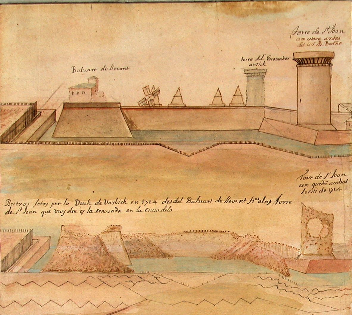 *Font de la imatge: UB CRAI Biblioteca de Fons Antic. Manuscrit: 07 Ms 95 f. 134 v (Il·lustració de les bretxes provocades pels bombardejos del Duc de Berwick al Baluard de Llevant de la muralla de Barcelona, el 1714).