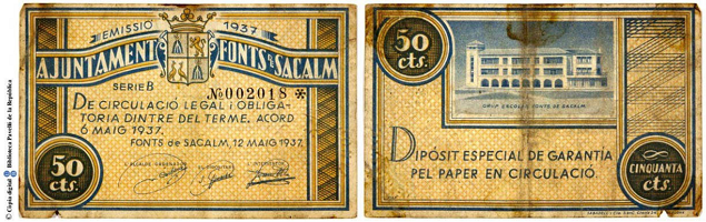 La col·lecció de Paper moneda del CRAI Biblioteca del Pavelló de la República consta de més de 300 unitats documentals. La majoria són bitllets locals emesos majoritàriament durant el període de la Guerra Civil a Catalunya. També hi ha emissions estatals del període franquista, de la Dictadura de Primo de Rivera i de la II República i d'alguns municipis d'Aragó del període de la Guerra Civil. A més, hi ha una petita mostra de paper moneda de l’estranger (Alemanya, Cuba, Rússia, Vietnam, etc.).