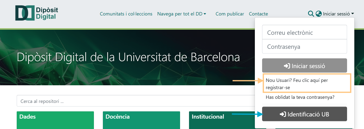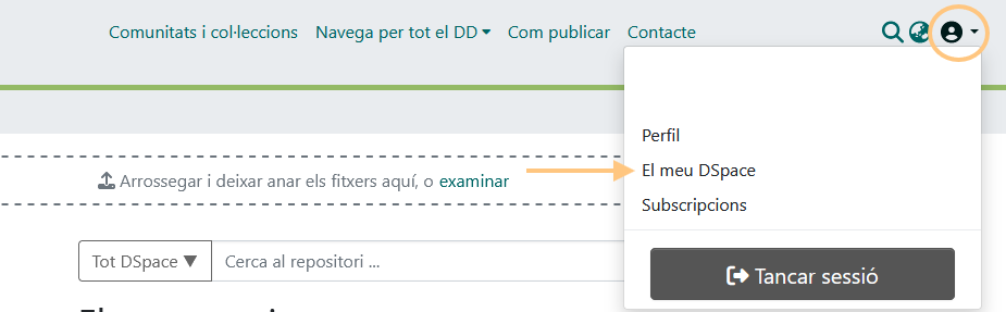 Per iniciar el lliurament del document, identifica't al Dipòsit Digital i, des del teu perfil, accedeix a l’opció «El meu DSpace».
