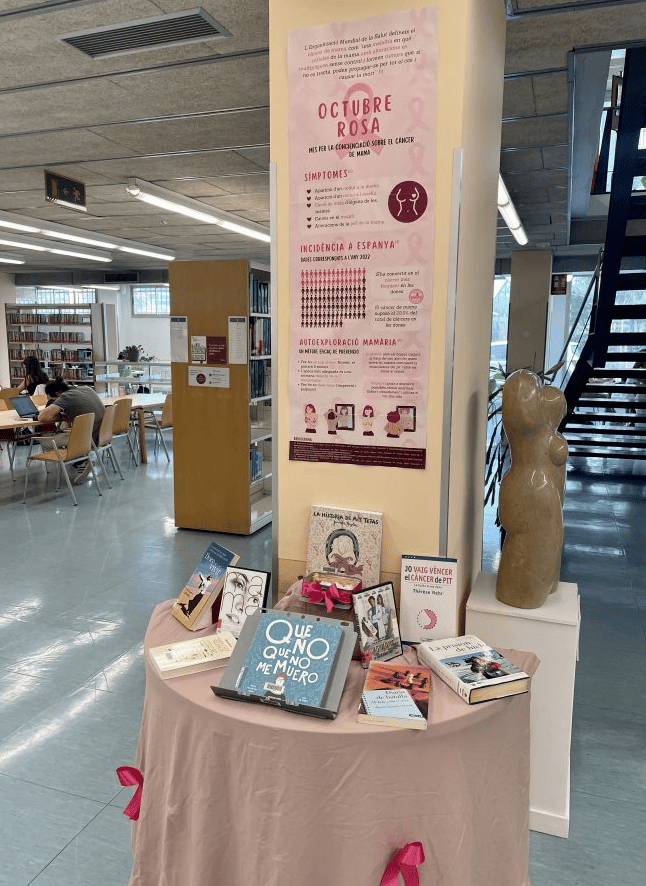 El CRAI Biblioteca del Campus Bellvitge s’ha volgut sumar a aquesta iniciativa creant un aparador on s’exposen obres que tracten el càncer de mama des de diferents perspectives, el qual s’acompanya d’una infografia que contempla definicions, estadístiques i altres dades destacades sobre aquesta patologia.